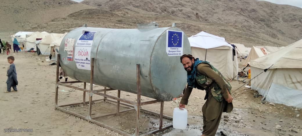 In the onset of the crisis in September 2025, DACAAR became a source of hope for displaced families. With financial support from the European Union (EU), DACAAR has been assisting people in Zirri Baba Camp by providing handwashing stations, placing dustbins, distributing hygiene kits, and conducting hygiene promotion sessions to help people protect themselves from diseases. Emergency Baths and Latrines (EBLs) were also installed to improve sanitation. Most importantly, every single day, trucks delivered 49,500 liters of safe drinking water, enough to meet the needs of 791 families (5,437 individuals).